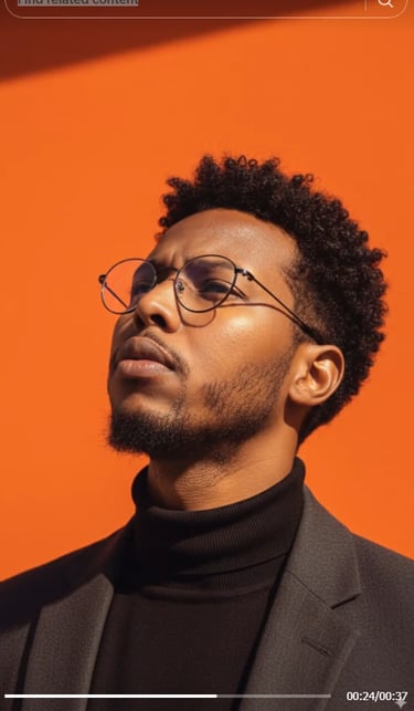A captivating portrai a man with tousled, dark hair and a well-groomed beard, looking upwards with a thoughtful and contemplative expression. He is wearing round spectacles and a black turtleneck sweater under a dark jacket. The lighting is dramatic and harsh, with strong, angular shadows cast across his face and the vibrant orange background, creating a high-contrast and intense mood. The setting appears minimalist with a plain, brightly colored wall. The camera angle is a low-angle close-up, emphasizing his upward gaze and strong jawline. The overall style is modern and sophisticated, with a cinematic feel. Format: vertical full-frame shot, high-definition. Use my face details from uploaded photo,"